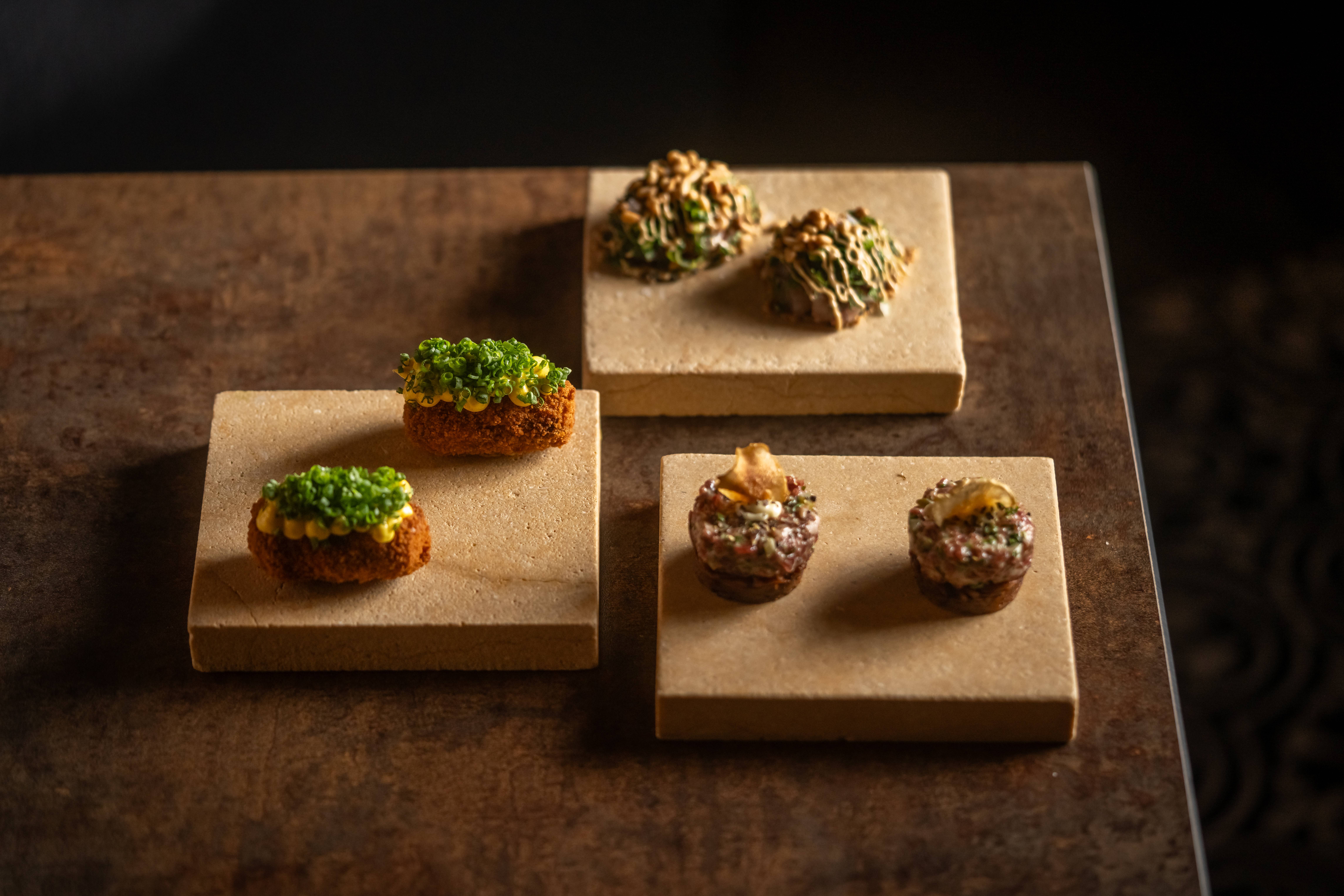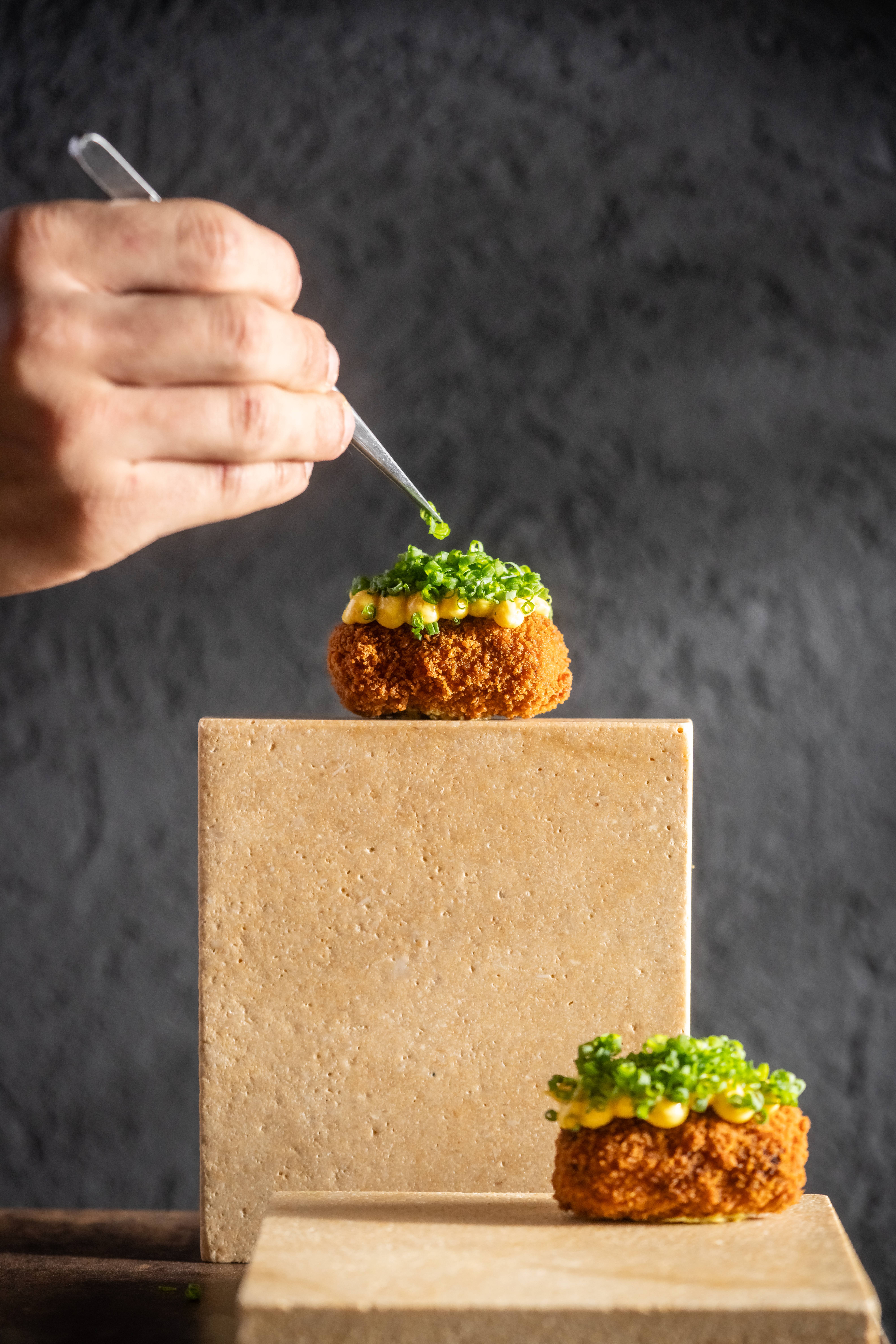 Some dishes are served on stone plates reminiscent of Jerusalem stone, with small olive branches crowning the presentation.