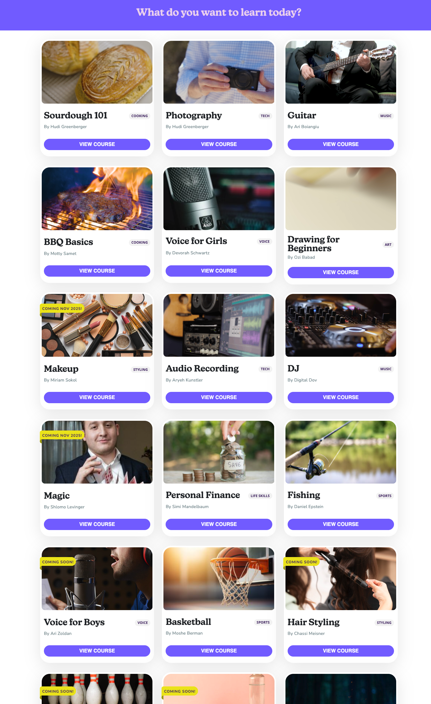 - Awesome courses, taught by top talent! Think Devorah Schwartz for voice lessons, Ozi Babad for drawing, Hudi Greenberger for photography, Shlomo Levinger for magic…and so many more.