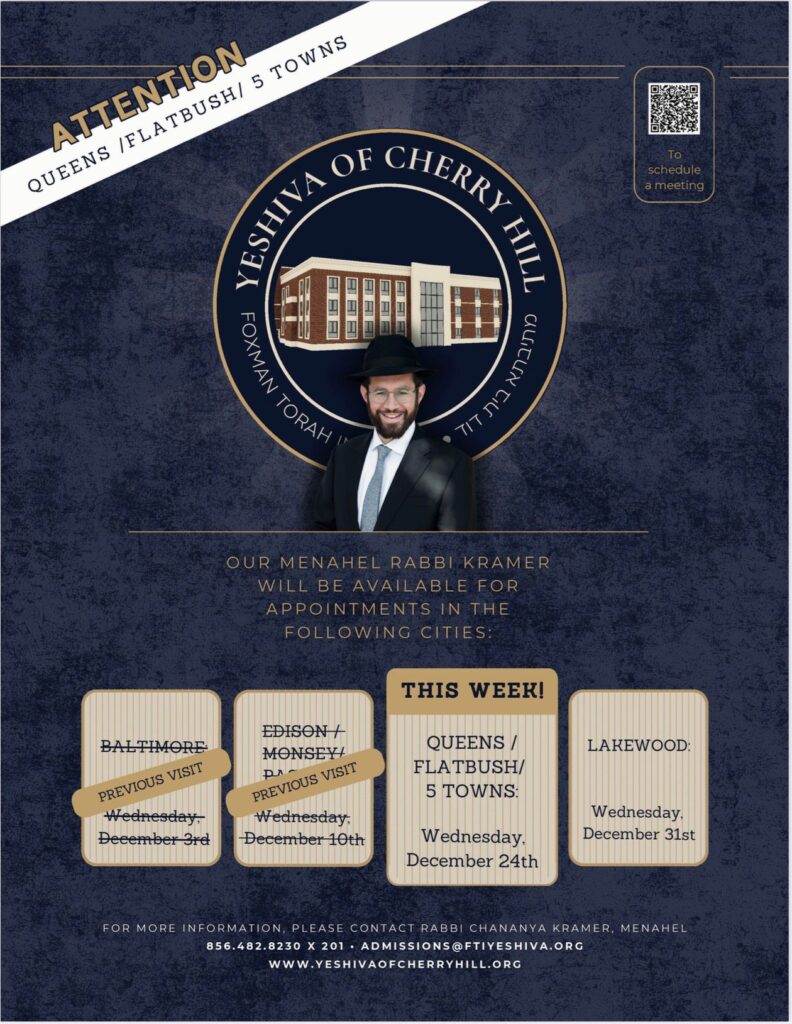 ๐ฃ Attention Five Towns! Yeshiva of Cherry Hill’s Menahel, Rabbi Kramer, will be in the Five Towns on Wednesday, December 24th for appointments.
