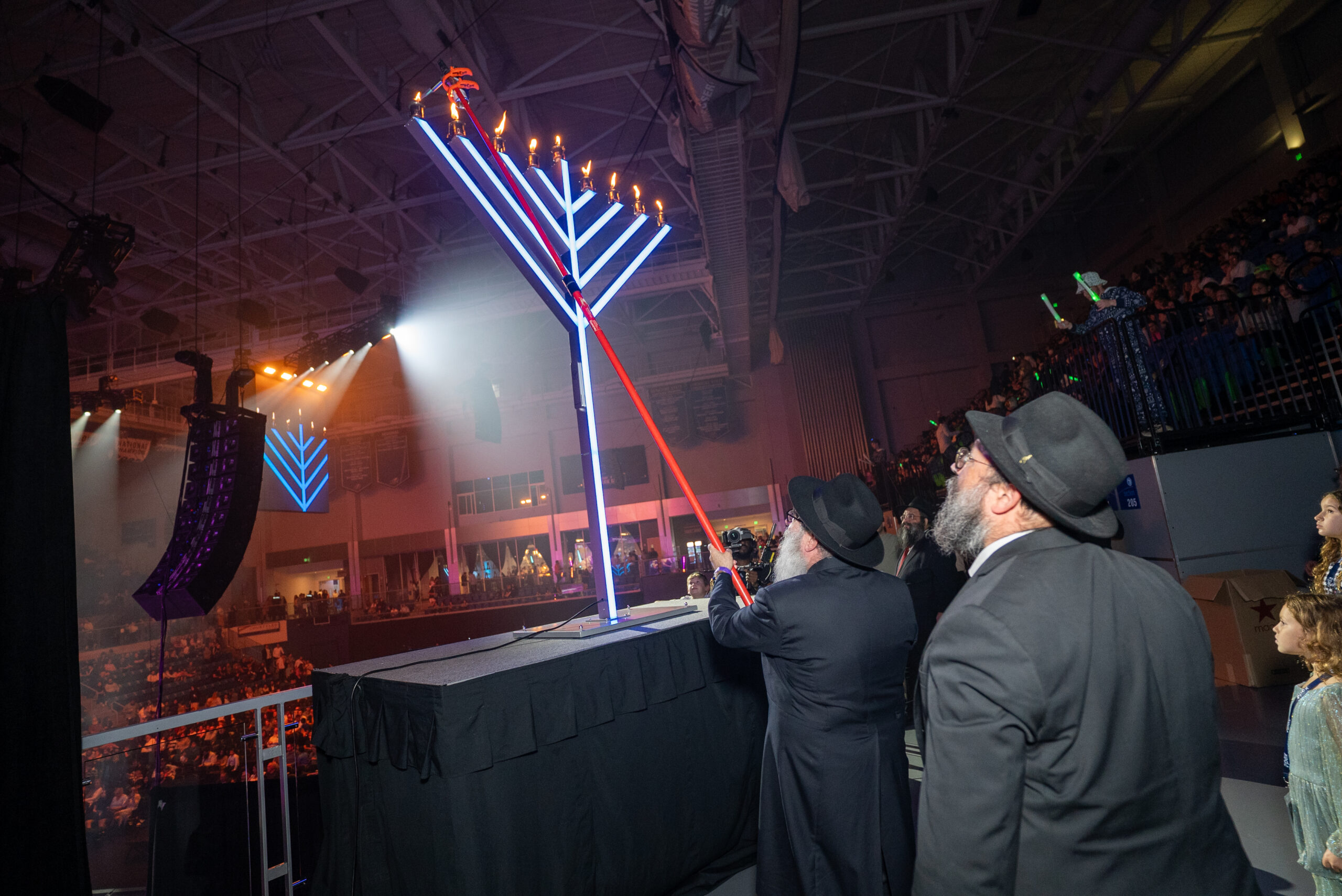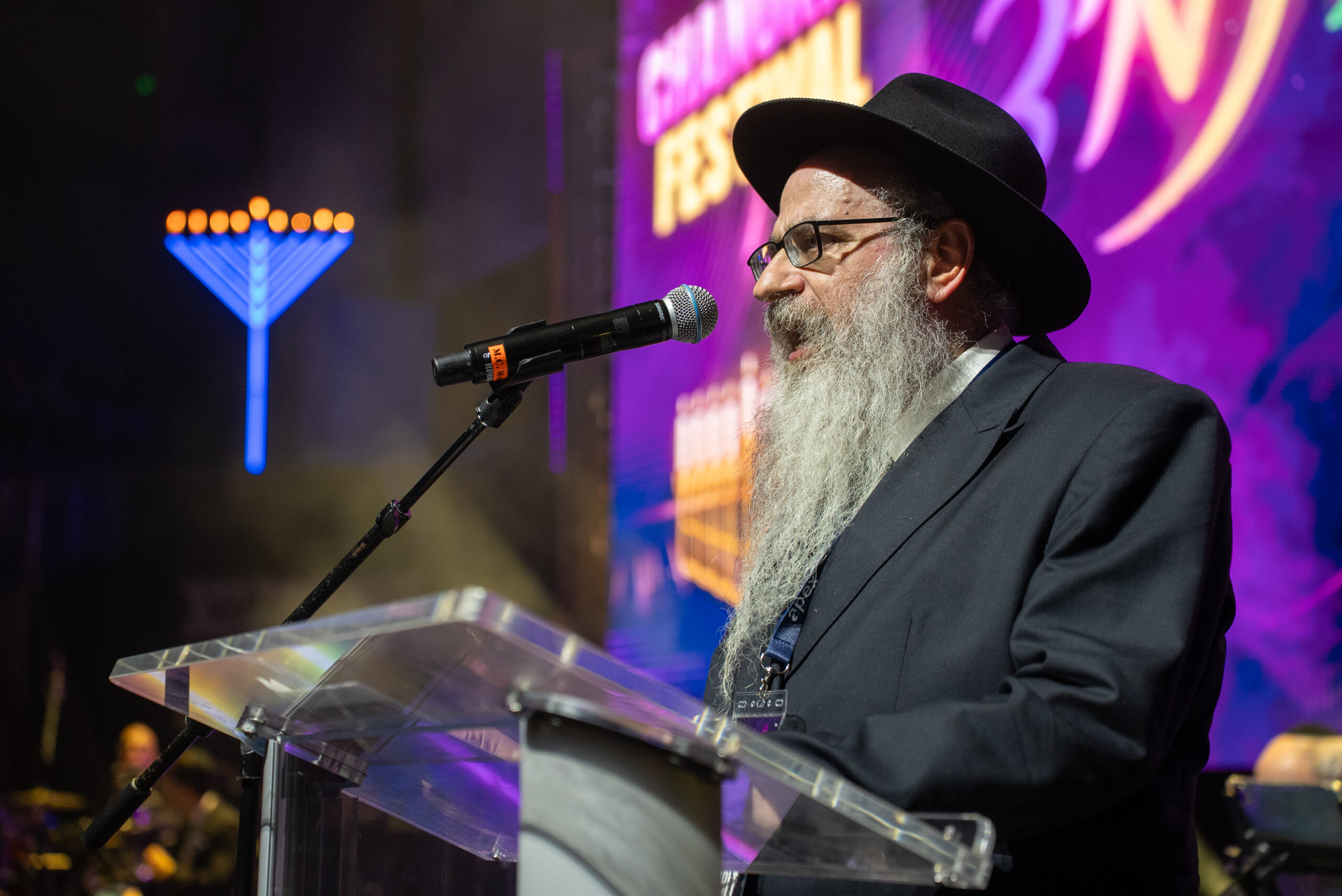 The evening opened with the recitation of the 12 pesukim, uniting thousands in words of faith, strength, and connection. Immediately after, the lighting of the menorah — performed by donors whose generosity makes the Chanukah Festival possible year after year — filled the arena with light.