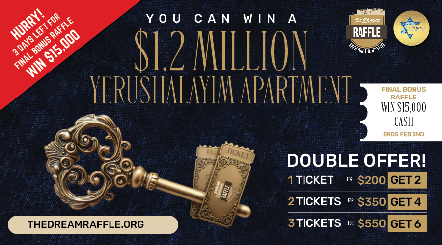 Win a $1.2 million, fully furnished Jerusalem Apartment + entry into the final bonus raffle on Tu B’Shvat for $15,000 cash.