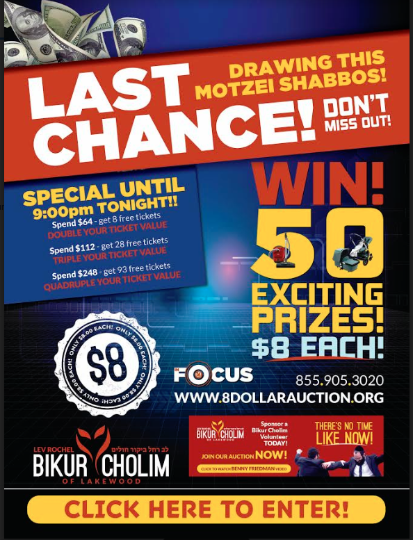Bikur Cholim of Lakewood’s auction drawing is THIS MOTZAI SHABBOS!