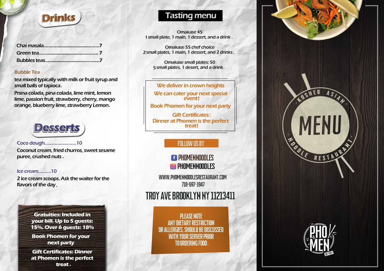 The restaurant’s signature menu items are Pho and Ramen, thus the name: PhoMen. Located on 411 Troy Avenue, PhoMen is pioneering the introduction of these unique dishes into the Kosher world.