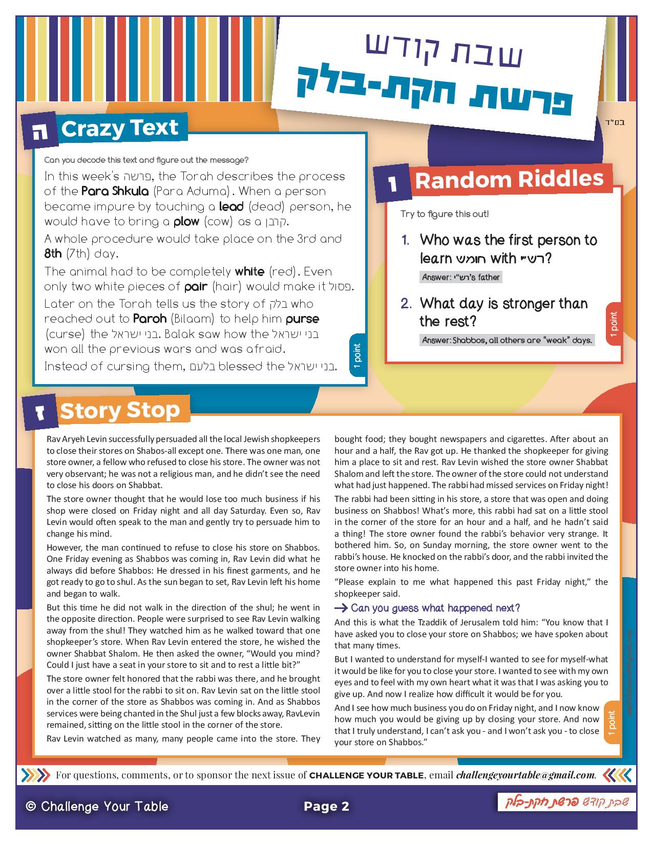 Today, so many Parsha publications are available for the adult reader. Not as much has been created to cater to the needs of our younger generation. Challenge Your Table was born to entertain and engage our children at the Shabbos table in a fun and educative way. Parents, beware: you may end up having as much fun as the children!!