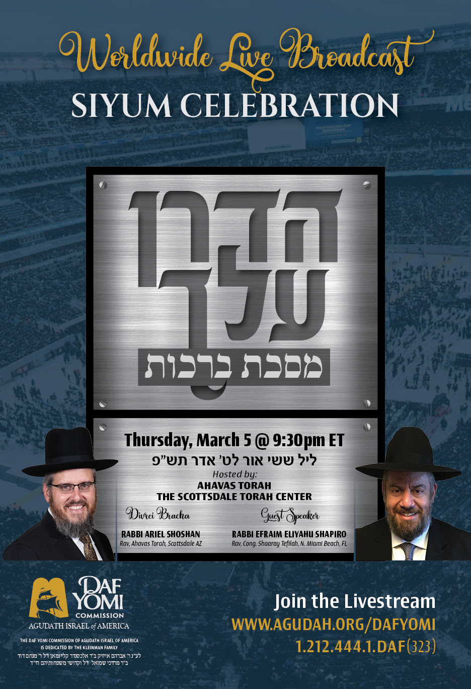 The siyum on Berachos will take place at Scottsdale’s Ahavas Torah at 9:30 EST and will be livestreamed to tens of thousands across the world, with Rabbi Ariel Shoshan, Rav of Ahavas Torah, Scottsdale, offering divrei brachah, followed by special guest speaker Rabbi Ephraim Eliyahu Shapiro, Rav, Congregation Shaarei Tefilah of North Miami Beach. Several other large exciting community events will also mark the completion of Maseches Berachos, including a March 7th Flatbush communitywide Motzoei Shabbos siyum, at 8:30 PM, with music and dancing, at Congregation Har Halebanon; featuring inspiring words of Chizuk from Rabbi Paysach Krohn and Rabbi David Ashear.