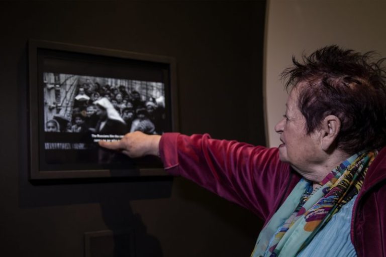 Staring at grainy video footage of Jewish children marching to their freedom though the barbed-wire fences of the Auschwitz death camp, 79-year-old Vera Kriegel Grossman excitedly points a finger at