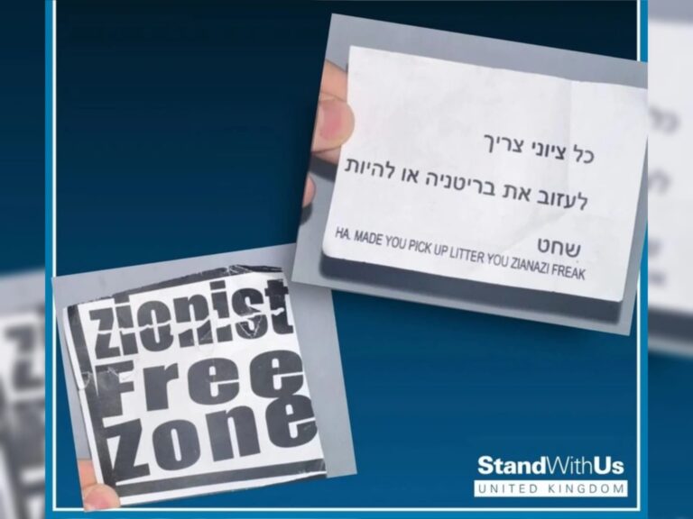 Antisemitic leaflets bearing the threat “Zionists leave Britain or be slaughtered” have been found across Hendon, a predominantly Jewish neighborhood in London. The flyers, written in Hebrew, also declared the